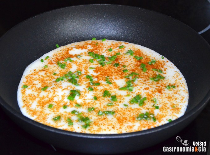 Mientras empieza a cuajar a fuego medio, condimenta con las especias al gusto, pica el cebollino bien fino y añádelo también. Tapa un poco la sartén para favorecer que el calor se condense en la superficie y cuaje la clara de huevo.