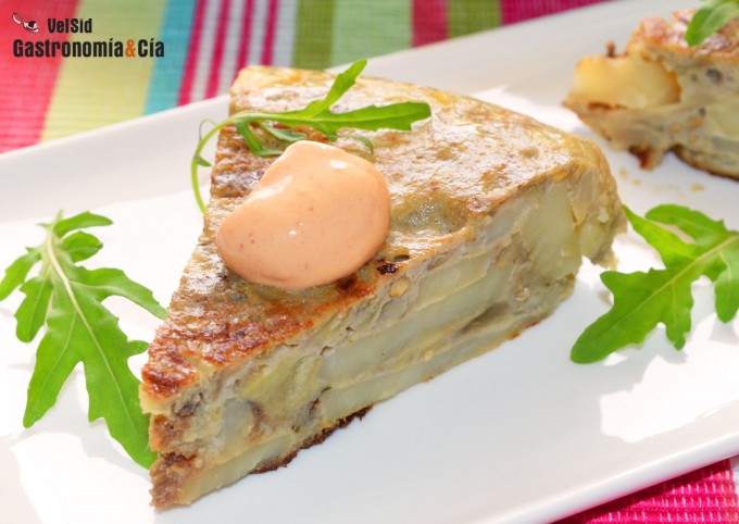 Sirve la tortilla de patatas y berenjena con anchoas cortada en porciones o pinchos, acompáñala con la mahonesa picante, o si lo prefieres con un poco de alioli, aunque sola también está deliciosa. Otra opción es servir la tortilla con unas rebanadas de pan con tomate, ¡para chuparse los dedos! ¡Buen provecho!