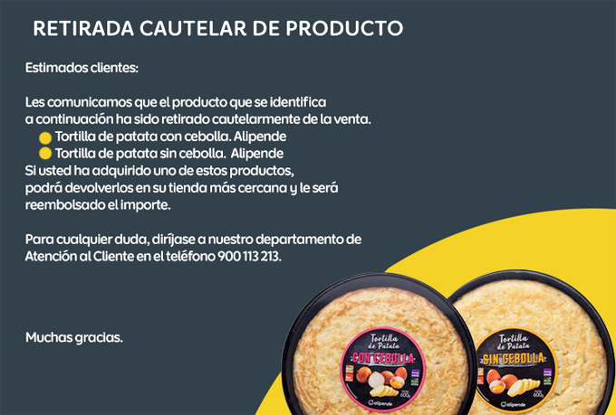 La cuestión es que se han retirado del mercado algunas tortillas de patata que fabrica la empresa Palacios y que envasa bajo la marca de la cadena de supermercados Ahorramás, son las tortillas de patata Alipende, con cebolla y sin cebolla. Esta fue la primera retirada del producto, a la que se ha sumado la que ha anunciado Eroski, que de forma cautelar ha retirado todas las referencias de tortilla de patata que le suministra el Grupo Palacios.