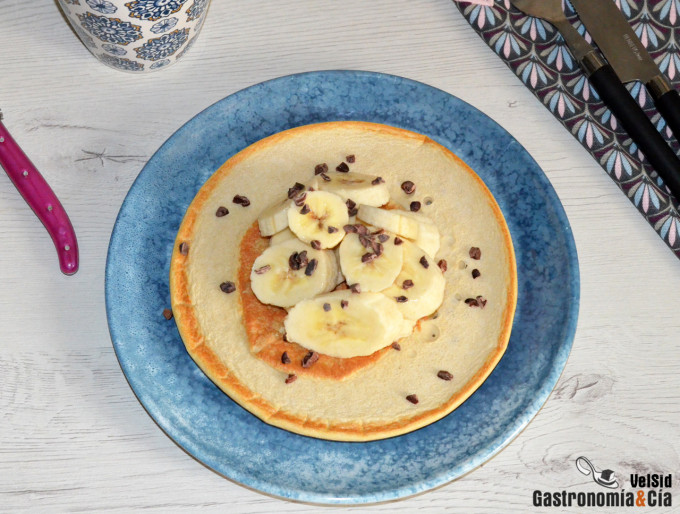Sucede lo mismo con la salsa de chocolate, ¿por qué no va a ser saludable si el cacao lo es? La salsa de chocolate que no nos conviene es la que venden en los supermercados (por ejemplo), son siropes cuyo primer ingrediente es el azúcar, jarabe de azúcar, glucosa o como le quieran denominar, pero es muy fácil hacer un sirope con cacao puro y un poquito de agua u otro líquido, como la leche o una bebida vegetal, y se puede endulzar con lo que se desee. La receta de esta salsa ya la tenéis en el blog, pero ahora la podréis ver también en esta receta de tortita proteica de avena, plátano y chocolate, porque hoy os traemos un desayuno saludable y nutritivo que repetiréis, no puede estar más rico.