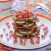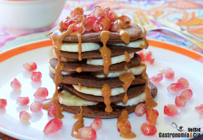En un plato llano coloca una tortita, cúbrela con unas rodajas de plátano, después coloca otra tortita y una vez más cubre con plátano, otra tortita y más plátano y así hasta terminar. Reparte los granos de granada y termina con la crema de cacahuete vertiéndola a hilo, y a disfrutar. ¡Buen provecho!