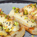 Pela el plátano y córtalo por la mitad horizontal y longitudinalmente. Pela unos pistachos tostados y mézclalos (opcionalmente) con unas almendras Marcona tostadas, pica groseramente a cuchillo, no muy fino para que después se encuentren los frutos secos en cada bocado.
