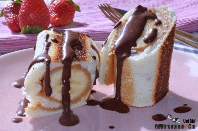 Puedes servir las tostadas enrolladas rellenas de plátano y cacahuete cortadas en dos, cuatro trozos… o del tamaño de un bocado. Salsea con el sirope de chocolate y ¡buen provecho!
