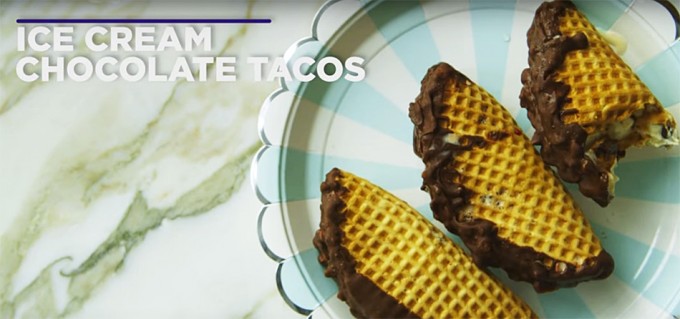 El truco que más nos gusta es el segundo, con el que se prepara un helado en forma de taco con su galleta y su baño de chocolate. Para conseguir una galleta con forma de taco se parte de unas tartaletas o cuencos de gofre crujientes, se vierte en su interior un poco de sirope de arce, se coloca en un plato y se cubre con una servilleta o un paño. A continuación se lleva al microondas y se programan 30 segundos, la galleta se ablandará.