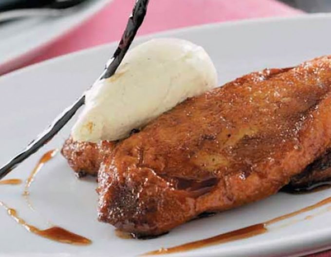 Torrija de pan caramelizada con caramelo de naranja y helado de arroz con leche de José Miguel Olazabalaga