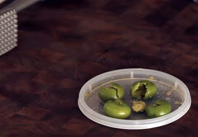 Sobre estas líneas podéis ver un segundo truco para deshuesar aceitunas fácilmente, aunque seguramente no será fácil para todos, pues hay que tener traza y resistencia en los dedos. El truco es de uno de los colaboradores de Jamie Oliver, Gennaro Contaldo, quien propone presionar con los dedos los dos extremos de una aceituna con el mismo objetivo con el que se hace el truco del cuchillo, rajar la pulpa y extraer fácilmente el hueso. No dudamos que con unas manos fuertes y mañosas sea una forma rápida de quitar el hueso de las aceitunas, pero quizá no sea la mejor para todos.