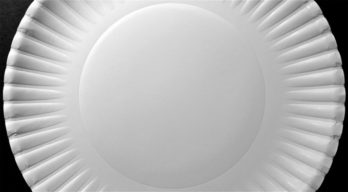La siguiente foto lo ilustra muy bien, hablamos de plato de papel, pero también puede hablarse de una bandeja, pues estos accesorios desechables están disponibles en distintos tamaños y formas. Dependiendo del recipiente en el que normalmente se monte la nata o lo que sea que provoca tantas salpicaduras, deberemos disponer de un plato o de una bandeja de papel/cartón, esas que se venden con su blonda para presentar tartas y pasteles en cualquier supermercado.
