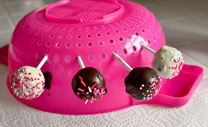 Ya habéis leído el titular, ya habéis visto la foto, hoy compartimos con vosotros un truco de cocina muy sencillo y a la vez muy práctico, y es utilizar un colador como soporte para los bombones o cakepops bañados con chocolate. Claro, no hablamos de un colador de maya fina, sino de los que tienen agujeros o una maya con orificios grandes, sea de plástico como el de la foto, de acero inoxidable o esmaltado.