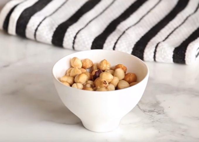 Justin Chapple propone tostar las avellanas en el horno colocando una bandeja y sobre ella la rejilla que después facilitará el cribado. Una vez tostadas las avellanas no será necesario manipularlas, es decir, cambiarlas de sitio. Sólo habrá que esperar a que se enfríen un poco para no quemarse, y entonces utilizar las manos para frotarlas contra la rejilla suavemente y con movimientos circulares. De este modo, la piel de las avellanas caerá a la bandeja, mientras que las avellanas se quedarán en la rejilla.