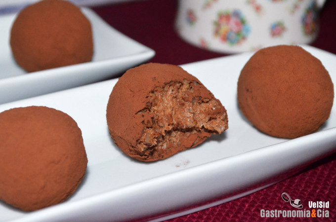 Saca las trufas del frigorífico antes de servir, disponlas en un plato y listo, en cuento prueben la primera, volarán. Por cierto, se pueden decorar estas trufas colocando un cuarto de nuez en la parte superior y presionando un poco. También tienes la posibilidad de rebozarlas en fideos o virutas de chocolate negro, a ser posible, sin azúcar. ¡Buen provecho!