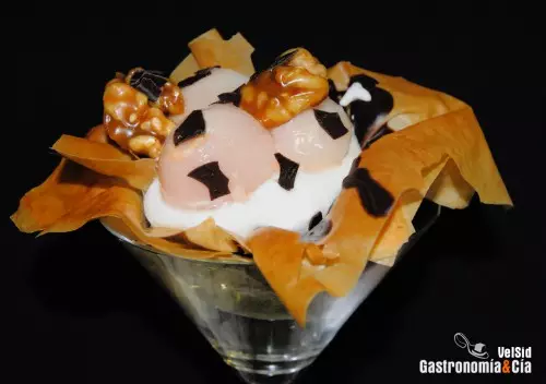 Aunque el chocolate ayuda a que la pasta filo no se reblandezca, este postre conviene montarlo antes de servir, teniendo todo preparado será un momento. Los lichis ponlos en un colador para que pierdan todo el almíbar posible y no deje la nata aguada.