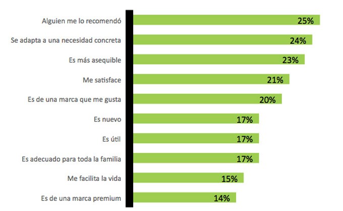 Según el informe de Nielsen, una cuarta parte de los consumidores que adquieren nuevos productos recibieron recomendaciones de otras personas, en el gráfico bajo estas líneas podéis ver que este canal de información se clasifica en primera posición. Pero hay una novedad, además de la familia y los amigos, la tienda e internet son las principales vías de información sobre los nuevos productos alimentarios que se lanzan al mercado, algo que años atrás no destacaba de forma significativa. Los principales motivos por los que se adquiere un nuevo producto son: las recomendaciones (25%), satisface una necesidad concreta (24%), es más asequible (23%), satisface al consumidor (21%), pertenece a una marca afín al consumidor (20%), es una novedad (17%), es útil (17%), es adecuado para toda la familia (17%), facilita la vida (15%), y finalmente, su pertenecía a una marca Premium (14%).