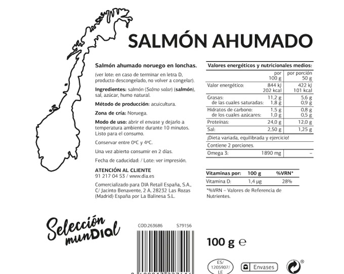 Aunque la AESAN no facilita más datos, nos gusta conocer de dónde proceden los productos que se venden bajo la marca de una cadena de supermercados, y como vemos en el dorso del envase de salmón ahumado retirado del mercado por el riesgo de provocar listeriosis, este producto de piscifactorías noruegas lo produce La Balinesa, pero no hemos encontrado ningún comunicado ni por su parte ni por la de DIA.