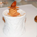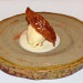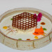 El primer postre rinde homenaje a la miel que producían las abejas en las colmenas artesanales que los campesinos instalaban en los bosques, predominaba la producción de miel de romero y tomillo, pero también de muchas otras flores. Con el nombre de Miel fermentada y flores, llega a la mesa una pequeña cúpula que imita a una colmena, es de cerámica modelada, creada por uno de los artistas ibicencos de mayor reconocimiento, Antoni (‘Toniet’) Ribas Costa. Se retira la campana y se descubre un helado de hidromiel sobre una crema de miel, unas gotas de miel de distintas variedades y un crujiente con forma de panal espectacular. Quienes hemos podido disfrutar de la miel de verdad (os recuerdo que en nuestra familia había apicultores), podemos apreciar en este postre aquel sabor al masticar la miel directamente de un trozo de panal, y por si alguien se lo pregunta, en absoluto resulta empalagoso.