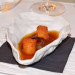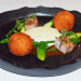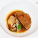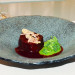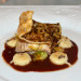 Gerret, garum y escalivada es la tercera propuesta del menú, y a pesar de que es un plato con mucho sentido en el menú, es el que menos nos gustó. Nos cuenta Daniela, jefa de sala de UNIC, que el gerret es un pescado que se encuentra en todo el mar Mediterráneo, pero suele ser un pescado de descarte, mientras que en las Islas Baleares, y especialmente en Ibiza, es uno de los pescados más populares, muy enraizado en su cocina. David Grussaute lo presenta en forma de buñuelo, crujiente por fuera y meloso por dentro, acompañado del recuperado ‘garum’, bastante salado, y una escalivada, que además de acompañar muy bien la salinidad del plato, se elabora con el producto de temporada de la huerta cercana.