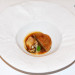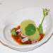 Continuamos con Calamar, caracol, clorofila de mar y campo, el producto marino y el caracol de una granja local conforman un dueto que no compite en sabor y que concilian en textura, es un bocado perfecto entre mar y montaña, potenciado con ficoide glacial y capuchina, y de nuevo bañado con un caldo sublime, así como con un aire que no se desvanece, que realza los sabores y refresca el paladar.