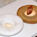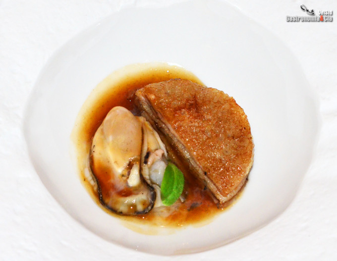 Del siguiente plato no nos sale decir nada más que onomatopeyas, a nuestro parecer es uno de los mejores platos del menú, y su nombre también dice mucho, se llama ’Mis orígenes’: Ostra, trigo de xeixa y vientre relleno. Transcribimos su presentación: “El sabor salvaje de la ostra de la costa de Burdeos es parte esencial de la infancia de nuestro chef. En este plato funde el golpe de mar que proporciona al paladar, con una crêpe elaborada con harina de ‘xeixa’, variedad autóctona de trigo que se cultivaba y molía en las granjas cercanas, y vientre relleno, un embutido tradicional”.