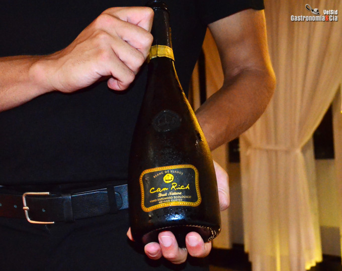 Quisimos empezar con un vino espumoso por aquello de brindar por nuestra celebración, así que probamos el Can Rich Blanc de Blancs Extra Brut, un Malvasía 100% que resultó ideal para abrir las papilas gustativas a la gastronomía ibicenca, un poco flojo en burbuja para nuestro gusto, pero muy agradable en boca con sus notas afrutadas y ligeramente cítricas. Brindamos y tomamos el primer bocado del menú, compuesto por Almendras y pollo payés, ambos son productos tradicionales de la isla. En la galería de imágenes tenéis la foto y presentación de cada uno de los platos del menú degustación, en este caso veréis un pequeño snack con una base crujiente, una mousse de pollo y la almendra ibicenca, también crujiente y sabrosa.