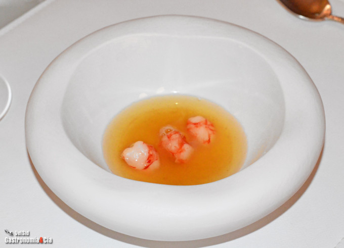 La sencillez visual del Dashi de Posidonia y gamba roja de Ibiza se agradece, es de esos platos que casi se pueden saborear antes de que la cuchara llegue a la boca. Hay que decir que el chef borda los caldos y fondos (entre muchas otras técnicas y elaboraciones culinarias que iréis viendo), son la base de una buena cocina, y en este en particular incluye la esencia de la Posidonia que, como sabréis, es una planta acuática, una especie endémica del mar Mediterráneo que conforma praderas submarinas de un valor ecológico incuestionable. La base del plato es un consomé de gamba ibicenca sobre el que se sirven la gamba roja en salmuera y un caldo o dashi de Posidonia y las cabezas y cuerpos de las gambas.