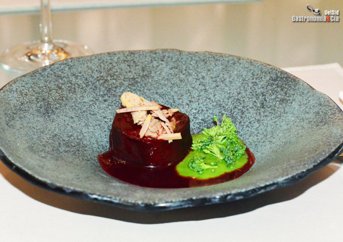 La parte salada del menú la cierra el Porc negre o Cerdo negro, como no podía ser de otra forma, y lo hace con una de las creaciones culinarias estrella de la gastronomía francesa, la royal. Es una Royal de Porc negre, mirto y remolacha, con un toque creativo que nos sedujo, el cilindro va envuelto en láminas de remolacha, y os preguntaréis qué es el mirto… Pues se trata de unas bayas también conocidas como arrayán o murta (Myrtus communis), muy apreciadas en las islas de Cerdeña y Córcega, donde elaboran un licor que porta su nombre.