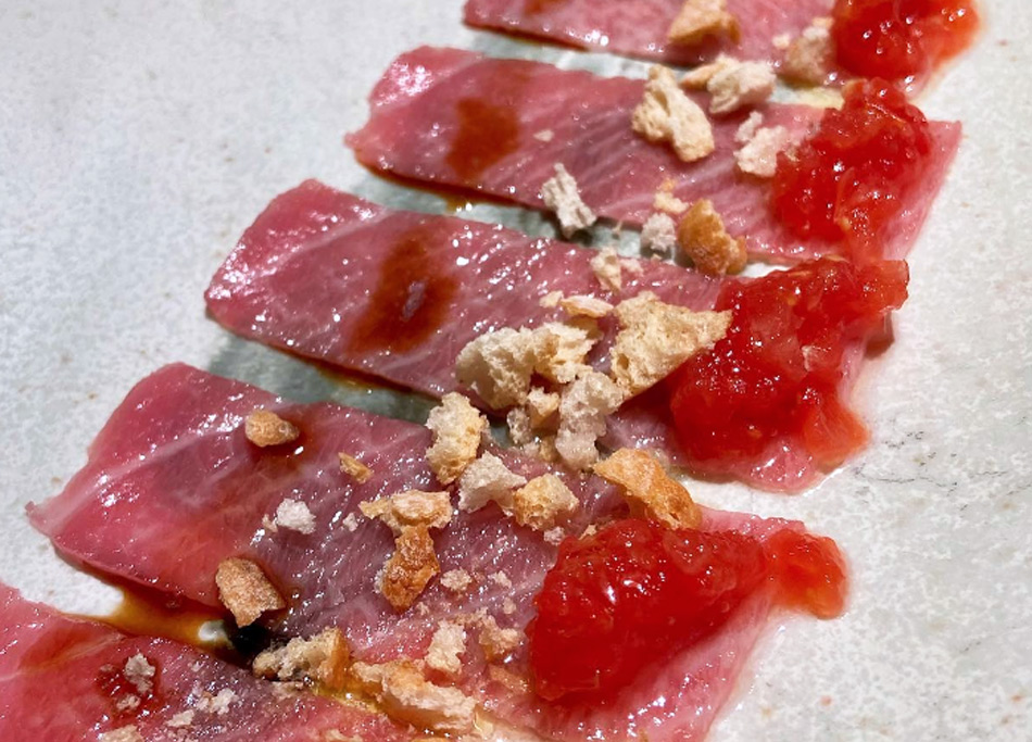 En cualquier caso, el reconocimiento de sus clientes y de las guías gastronómicas avalan su buen hacer y su creatividad culinaria. Hoy podéis verlo con una receta sencilla, el usuzukuri de mero que acompaña con un trocito de papa arrugada con mojo verde canario. Sobre el usuzukuri ya os hemos hablado, es una técnica del corte de pescado que en español se expresa como rebanada o corte fino, el usuzukuri es un corte muy preciso del pescado, al bies y tan fino que casi puedes ver a través de él