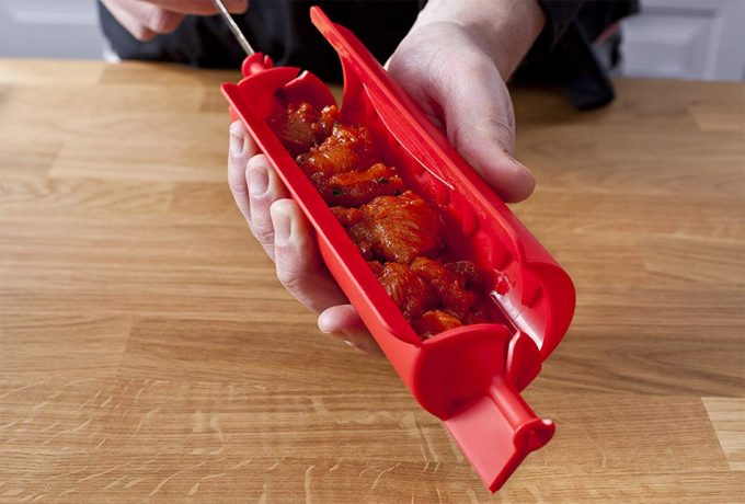 En las fotos podéis ver un utensilio que puede resultaros muy útil si hacéis brochetas habitualmente o con bastante asiduidad, se llama Quick Skewer XL, lo que se podría traducir como ‘brochetas rápidas tamaño XL’. El objetivo de esta herramienta es poder formar las brochetas de forma limpia, segura y fácil, pero ahí no acaba su utilidad.