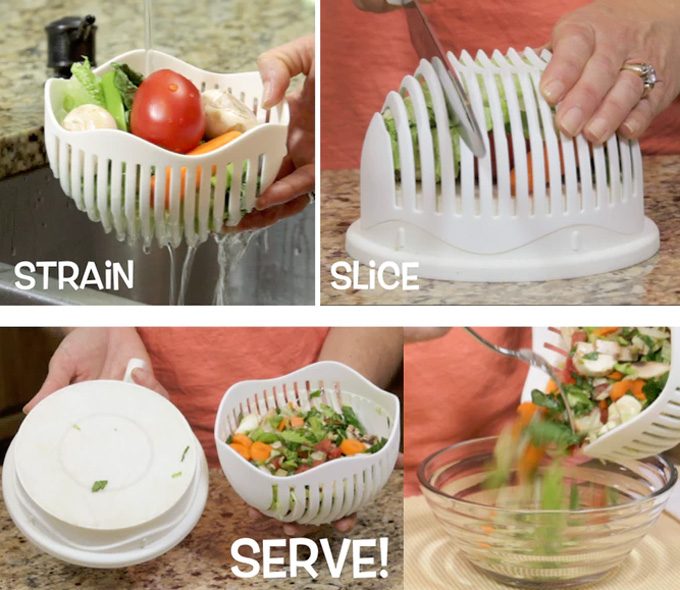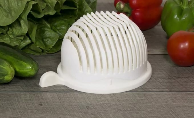 Hoy conocemos un nuevo utensilio de cocina pensado para hacer ensaladas en muy poco tiempo y sin hacer uso de ningún utensilio más, sólo un cuchillo. Ni siquiera es necesario utilizar la tabla de cortar ni el centrifugador de lechuga que tanto nos gusta para que nuestras ensaladas no queden encharcadas. Se llama 60 Second Salad Maker, y bajo estas líneas podréis ver un vídeo en el que se muestra cómo se utiliza, porque así, a simple vista, poca idea podemos hacernos de la versatilidad de este objeto.