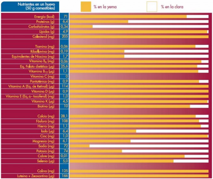 Inprovo difunde una tabla con los valores nutricionales del huevo, de 50 gramos comestibles de huevo (lo que podría representar un huevo mediano, cuyo peso ronda los 53-63 gramos). Además de dejar constancia de la composición media de un huevo y el porcentaje de nutrientes que aportan la yema y la clara, resume la siguiente información básica: