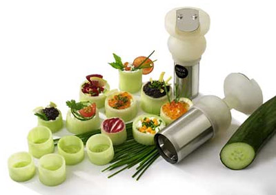 Hemos encontrado en una web de utensilios de cocina el Turn UP, un gadget que permite hacer vasitos comestibles por ejemplo con pepinos, calabacines, berenjenas, frutas, etc. Después los podemos rellenar con lo que deseemos, una crema de marisco, cuscús, vegetales, huevas…