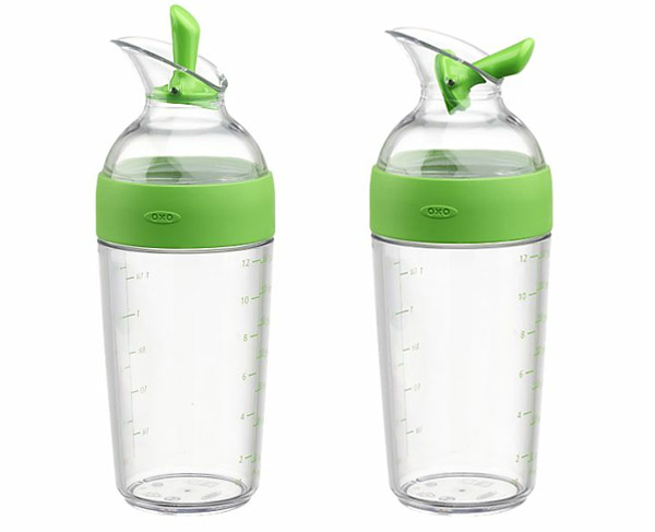 Dentro de la amplia gama de vasos agitadores para hacer vinagretas que se encuentran en el mercado, uno de los que más nos gustan es el Salad Dressing Shaker de Oxo, el que podéis ver en las fotografías. Tiene un diseño sencillo y actual, y es muy fácil de utilizar. Se abre como un vaso de coctelería para introducir los ingredientes, cuenta con medidas en tazas, onzas y mililitros. La tapa va a rosca, cerrando herméticamente y también la pieza del bocal, que da paso a la salida de la vinagreta, cierra impidiendo que el líquido se salga poniendo la vinagrera en cualquier posición.