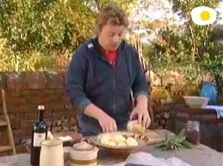 Jamie Oliver empieza esta videoreceta haciendo una guarnición de patatas y nabos, nos sugiere la posibilidad de sustituir el nabo por tupinambo (alcachofa de Jerusalén) o chirivías, adereza con salvia, ajo y parmesano.