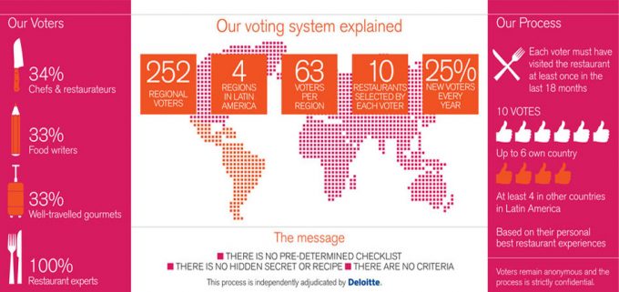 De momento y hasta que llegue el día de la gala, merece la pena recordar el funcionamiento y dinámica que se sigue para la configuración de la lista, hay que decir que no se han realizado cambios con respecto al año pasado. El listado se elabora a partir de las decisiones de un jurado formado por 252 expertos del panorama gastronómico latinoamericano que pertenecen a la Academia de los 50 Mejores Restaurantes de América Latina. Esta academia se divide en cuatro regiones, México y Centroamérica, Sudamérica Norte, Sudamérica Sur y Brasil, en cada una de ellas operan 63 miembros del jurado, gourmets, críticos gastronómicos, cocineros, etc.