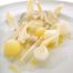 Añadir el jugo de asado (jugo que se desprende al cocer un pollo asado a la cazuela, colado, limpio y reducido a textura de caramelo) y las láminas de parmesano, terminar con el aire de remolacha, tallos y flores de cebollino.