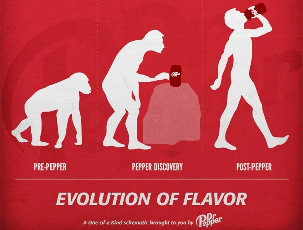 En la imagen podéis ver un cartel publicitario un tanto cómico, con el título ‘La Evolución del Sabor’, se puede realizar una comparativa con el gráfico de la teoría de la evolución, en realidad es humor gráfico con un mensaje sujeto a las estrategias de marketing. El caso es que algunos podemos creer que es un inocente anuncio en el que se muestra la fase Pre-Pepper, cuando el mono todavía no podía coger la bebida, le sigue la fase Pepper Discovery, el descubrimiento de la bebida, y finalmente el hombre que disfruta de la Pepper, la fase Post-Pepper. Para unos es un simple anuncio gráfico, cómico, creado por Dr Pepper Snapple Group Inc, la compañía que comercializa Dr Pepper, un refresco carbonatado, para otros en cambio es motivo de ira, llegando a vetar una bebida por publicidad con carácter evolucionista.