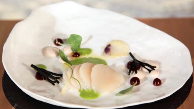 Sobre estas líneas podéis ver el sabor de la cocina atlántica que abandera el cocinero gallego Iván Domínguez, chef del Restaurante Alborada (1 estrella Michelin) y de los demás establecimientos del grupo Amicalia, como Arallo Taberna (en Galicia y recientemente inaugurada también en Madrid), Restaurante Ánima (Madrid), entre otros. Hace unos meses estuvimos en Alborada y en Arallo Taberna, y compartimos con vosotros nuestra experiencia. Pero hoy, desde la sección de Recetas de los Chefs, lo que tenemos es un buen plato, la Vieira a la sal, raíces y hierbas del litoral de Iván Domínguez.