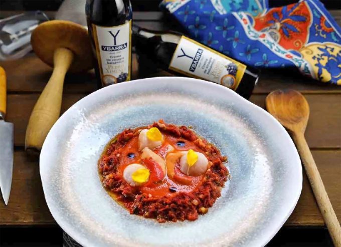 Se trata de unas Vieiras en escabeche de crema de vinagre de Jerez, pero las vieiras no van cocinadas en un escabeche, sino, acompañadas. Puede parecer que un escabeche podría resultar potente para combinar con un marisco tan delicado como el de este bivalvo, pero con mesura y saber hacer, se halla el equilibrio.