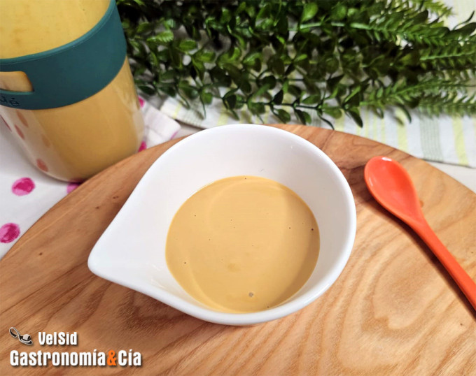 Tritura con la batidora de mano eléctrica y añade el agua que precise para obtener la densidad de la vinagreta deseada, en nuestro caso, añadimos la cantidad indicada en los ingredientes, para obtener una vinagreta ligera.