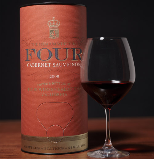 Acabamos de conocer los vinos Four, una empresa que ha lanzado al mercado su vino en tubos de cartón como si de una primicia se tratase. Evidentemente ya hace bastante tiempo que el vino se comercializa en cajas de cartón pero según indica esta empresa, se trata de una novedad porque el envase tiene forma de tubo, su capacidad es de tres litros y en ellos se encierran los vinos Cavernet Sauvignon y Petite Sirah que se producen en California (Estados Unidos).