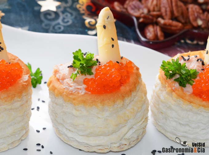 Cuando preparamos un buen menú para una ocasión especial, como son las fiestas navideñas, es fácil que tengamos que dedicar bastante tiempo a la cocina, por lo que a la hora de hacer el aperitivo solemos buscar recetas sencillas de hacer. Pero eso no quiere decir que no sean snacks o canapés exquisitos, especialmente si cuidamos los ingredientes. Es el caso de los Vol au vent con paté de salmón ahumado, espárragos y huevas que podéis ver ilustrando estas líneas, y cuya receta podéis leer a continuación.