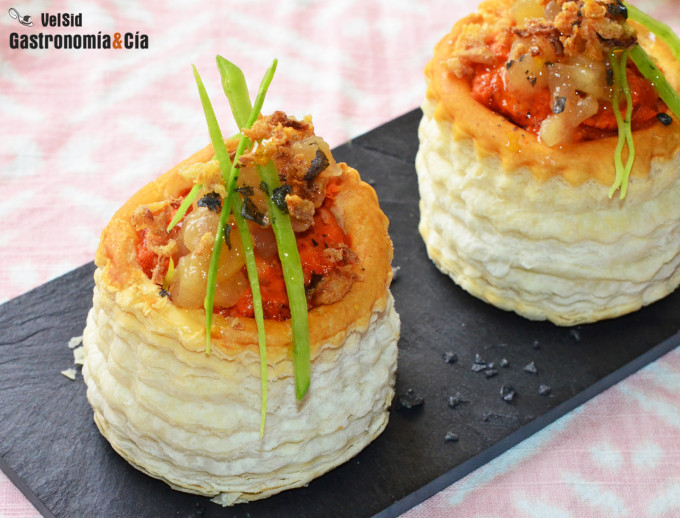 Puedes utilizar volovanes comprados o hacerlos con hojaldre siguiendo esta receta, tendrás que hacerlos con un poco de tiempo y dejar que se enfríen, quedan riquísimos.