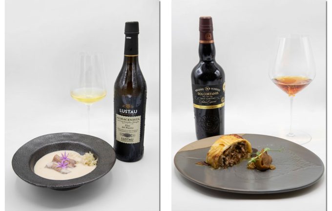 Plato principal: Manitas Wellington rellenas de carrillada ibérica al oloroso y foie ahumado y puré de chirivía, maridadas con Palo Cortado Dos Cortados de Bodegas Williams & Humbert.