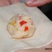Dispón las placas de wonton en la mesa de trabajo y pon en el centro una cucharadita del preparado de pollo, humedécete las manos y hazte con un cuenco con un poquito de agua para humedecer también la masa, toma en una mano una placa de masa con su relleno y con la otra humedece el wonton en toda la superficie que queda libre de relleno para que se adhiera bien, ciérralo presionando ligeramente pero sellándolo bien, puedes darle la forma que desees, de media luna, de ravioli… reserva. El relleno de pollo que pueda sobrar, resérvalo en un recipiente bien cerrado en el frigorífico, que os enseñaremos cómo hacer unas ricas hamburguesas.