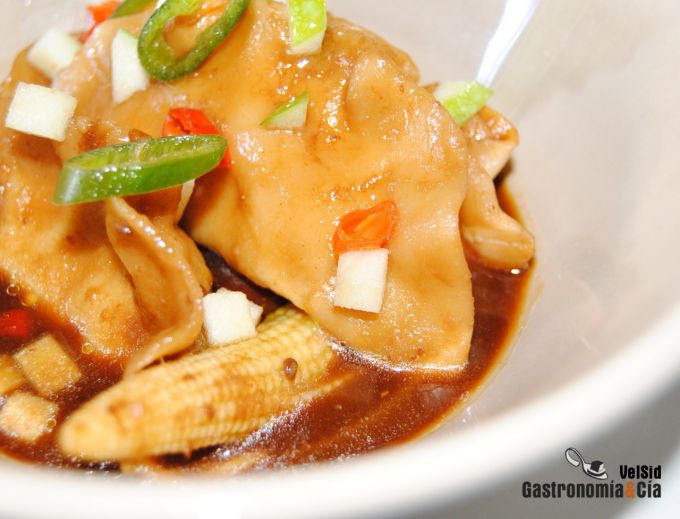 Una vez preparada la pasta con la que hemos elaborado el Wonton frito con sésamo, reservamos unas placas para hacer este delicioso Wonton de pollo con sopa de miso, es un plato que nos encanta, lo podemos elaborar en cualquier época del año porque está igual de rico si lo tomas bien caliente, recién hecho, resultando reconfortante y sabroso, o tibio (o completamente frío) si hace calor, es entonces un plato sabroso y refrescante.