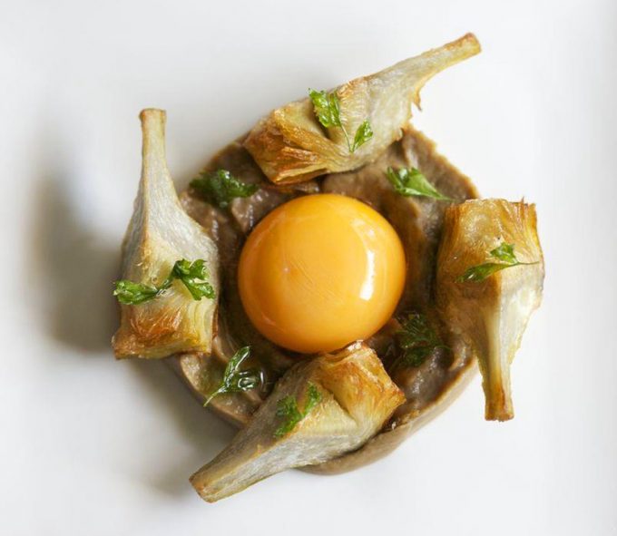 Esta receta de Yema de huevo con alcachofas y puré de berenjena asada de Paco Morales, chef del restaurante Noor de Córdoba, reconocido con 1 estrella Michelin, es ideal para este tiempo en el que las alcachofas están de temporada, y es una receta muy fácil de hacer, consiste en una base de berenjena asada en el horno, únicamente aderezada con sal y un buen aceite de oliva virgen extra y triturada para convertirla en una crema, sobre la que se posan las alcachofas que, para que estén más sabrosas, se pueden saltear con poco de aceite de oliva virgen extra y unos ajitos.
