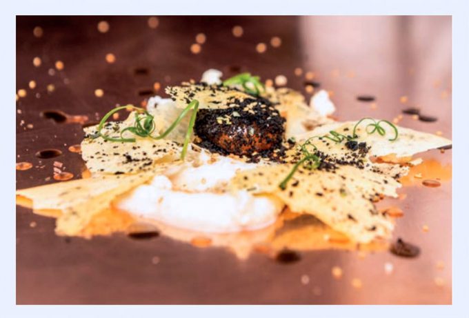 Con la ayuda de una cuchara, disponer en el plato una lágrima de puré de coliflor caliente. A continuación, la yema curada que se habrá templado con la ayuda de una salamandra. Dejar caer los brotes de coliflor encurtidos y por último la teja de aceituna Hojiblanca negra. Terminar el plato con sésamo espolvoreado, orégano y unas gotas de aceite de trufa.