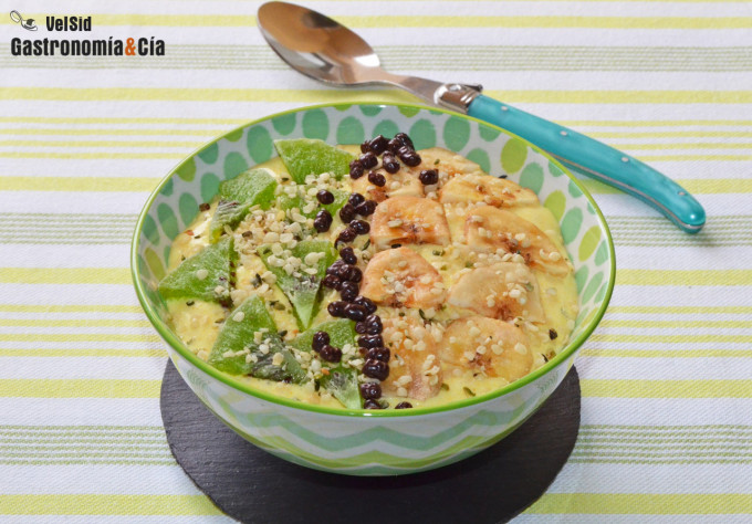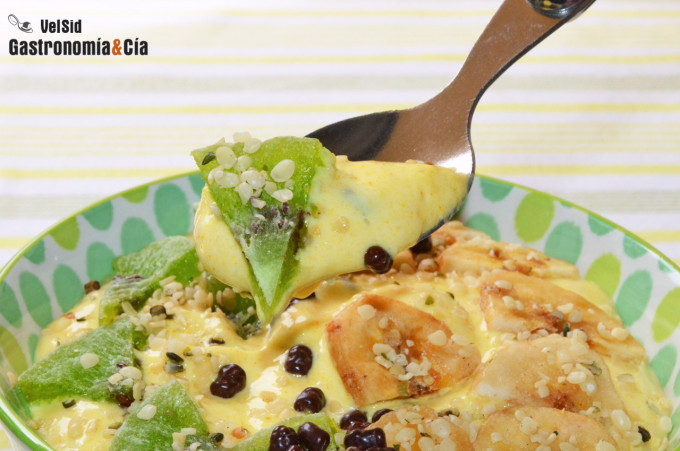Los postres de cuchara tradicionales están muy bien, pero de vez en cuando también nos gusta preparar recetas más inusuales, en ocasiones inspirándonos en las que son tradicionales en otros países, y en el caso de este Yogur colado con cúrcuma y frutas crujientes nos hemos inspirado en el Shrikhand, cuya receta podéis ver en este post. Este postre es tradicional de la India, y su base es el yogur colado, drenad o escurrido, una preparación que también es muy popular el Oriente Medio con el nombre de Labneh, y en los Países Bajos con el nombre de Hangop.