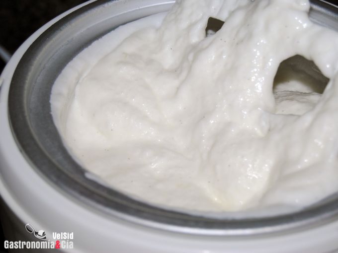 Cuando la base del helado esté bien fría, pon en marcha la heladora, vierte por el bocal el preparado de yogur y deja que la heladora trabaje durante 40 minutos.