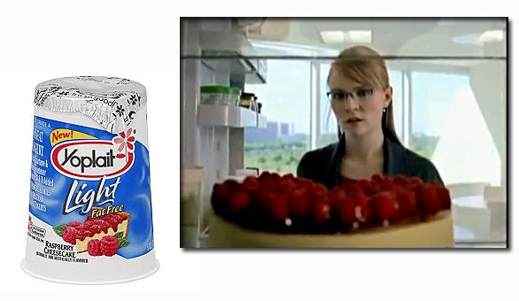 El producto de esta marca protagonista es el que veis en la imagen superior, la tarta de queso y frambuesa light, libre de grasas, la tentación es una gran tarta de queso y frambuesas que se puede apreciar a su lado. Después del salto podréis ver el vídeo del anuncio que ha retirado Yoplait por ser acusado de inducir a trastornos alimentarios, principalmente a la anorexia y a la bulimia, pero como sabemos, la lista de trastornos de la alimentación es mucho más amplia y podría pronunciar los problemas de quienes sufren permarexia, ingesta compulsiva de alimentos, etc.